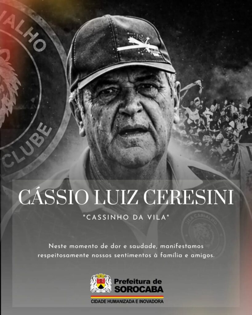 A Prefeitura de Sorocaba, por meio do prefeito Rodrigo Manga e suas atribuições legais, decreta luto oficial de um dia pelo falecimento do senhor Cássio Luiz Ceresini, conhecido como “Cassinho da Vila”, presidente da Associação Atlética Vila Carvalho.