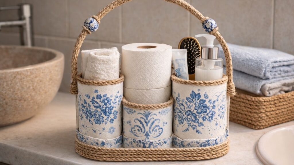 A personalização é uma das partes mais versáteis desse tipo de projeto e permite que o organizador combine com diferentes estilos de banheiro. Para um visual discreto, tintas em tons neutros, como branco, bege ou cinza, combinadas com cordas de juta, criam um aspecto rústico e alinhado à decoração sustentável.