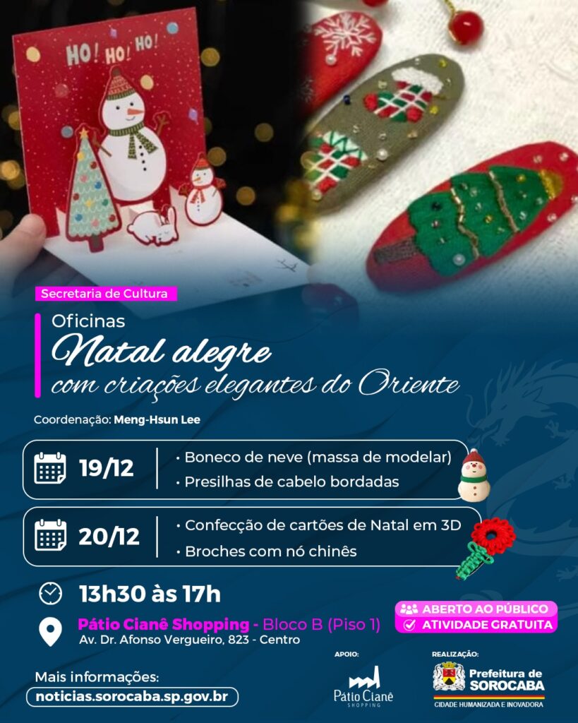 A oficina “Natal alegre com criações elegantes do Oriente”, da artista plástica Meng-Hsun Lee, chega ao Pátio Cianê Shopping, no Centro de Sorocaba. A programação de fim de ano é gratuita e será em dois dias, na próxima sexta-feira (19) e no sábado (20), das 13h30 às 17h, no Bloco B do empreendimento, no Piso 1.