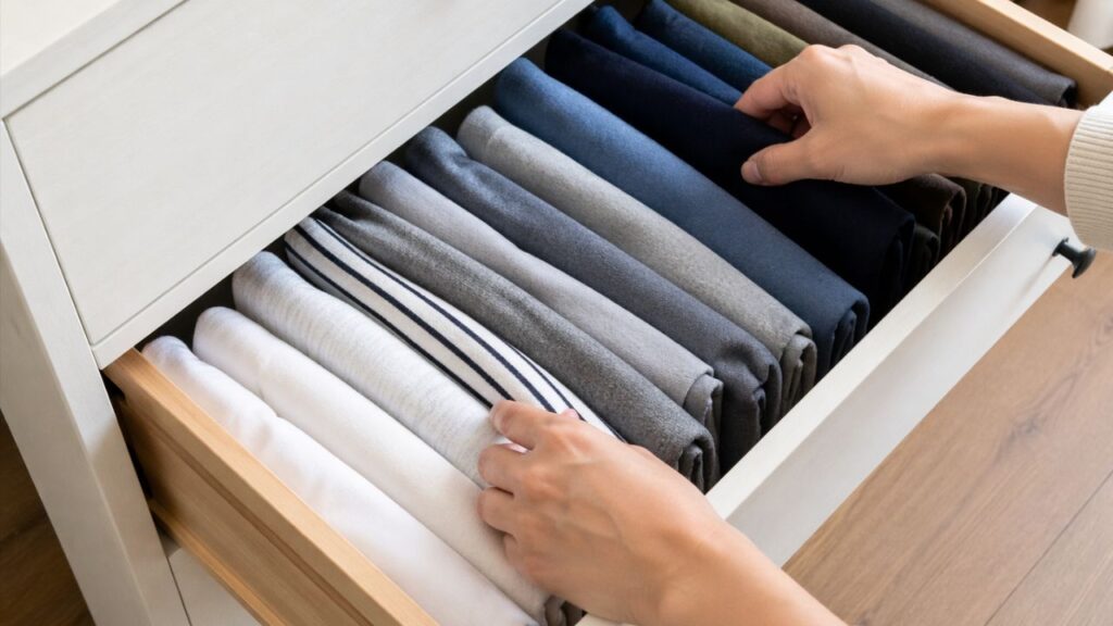 Esse método ganhou força com técnicas japonesas de arrumação, como o Método KonMari, criado por Marie Kondo, que propõe dobrar as peças de forma compacta para que fiquem firmes na posição vertical. Para quem mora em imóveis menores, a técnica ajuda a liberar espaço útil e até dispensa a compra de novos móveis, apenas reorganizando o que já existe.