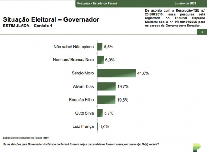 No primeiro cenário estimulado – em que o instituto cita os nomes dos possíveis candidatos – com a presença de Guto Silva (PSD), Moro lidera com 41,6% das intenções de voto. Em segundo lugar vem Alvaro Dias (MDB) com 19,7% dos votos, matematicamente empatado com Requião Filho, considerando a margem de erro de 2,8%.