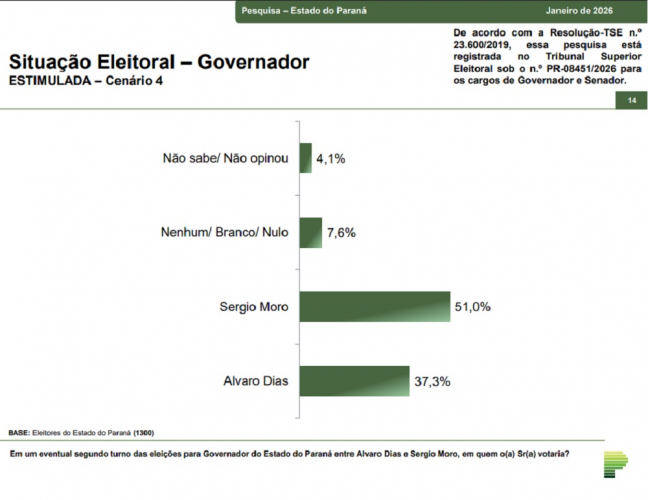 A coleta de dados da Paraná Pesquisas foi realizada entre os dias 18 e 22 de janeiro de 2025. Foram entrevistados 1300 eleitores em 54 municípios, garantindo grau de confiança de 95%, com margem de erro de 2,8 pontos. A pesquisa está registrada no Tribunal Superior Eleitoral sob o número PR-08451/2026.