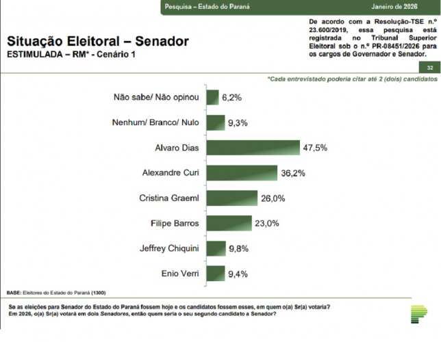 Em segundo cenário, sem Alexandre Curi, Alvaro salta para 52,2%, seguido de Cristina com 32,5% e Felipe Barros com 31,6%. Os eleitores do Paraná votam em dois senadores em 2026.