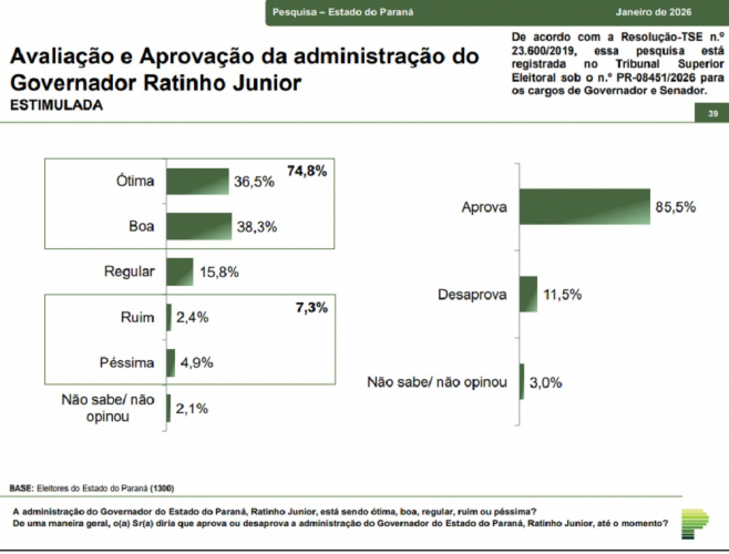 A pesquisa também avaliou a aprovação do atual governo paranaense. De acordo com o levantamento, 85,5% dos entrevistados aprovam o governo de Rainho Júnior no estado do Paraná. Em outro recorte, 74,8% consideram o governo ótimo ou bom.