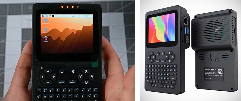 A Waveshare colocou à venda o PocketTerm35, um case portátil que acomoda um Raspberry Pi 4 ou 5 e entrega tela sensível ao toque, teclado físico, botões para jogos e bateria numa carcaça de 168,5 × 93,5 × 37 mm. O preço varia de US$ 88 a US$ 180 dependendo da configuração escolhida.