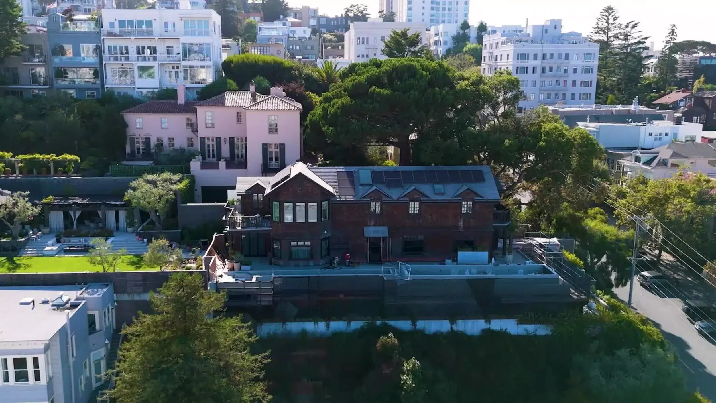 A casa de Sam Altman fica em Russian Hill, perto de North Beach, com múltiplas propriedades na mesma rua que custaram 65 milhões de dólares no total. Altman processa a construtora por infiltrações crônicas, mofo em paredes e tetos, e acabamento precário desde 2023, com laudos mostrando 200 pontos de vazamento. O complexo tem 882 m² úteis, vista para baía e garagem para 10 carros, mas problemas estruturais persistem apesar de reformas.