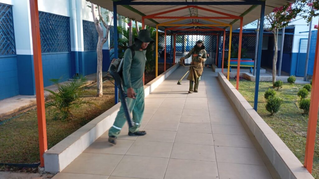 Os trabalhos contemplam pátios, áreas verdes, acessos e demais espaços externos das escolas, seguindo um cronograma definido pelas secretarias responsáveis, priorizando locais com maior necessidade.