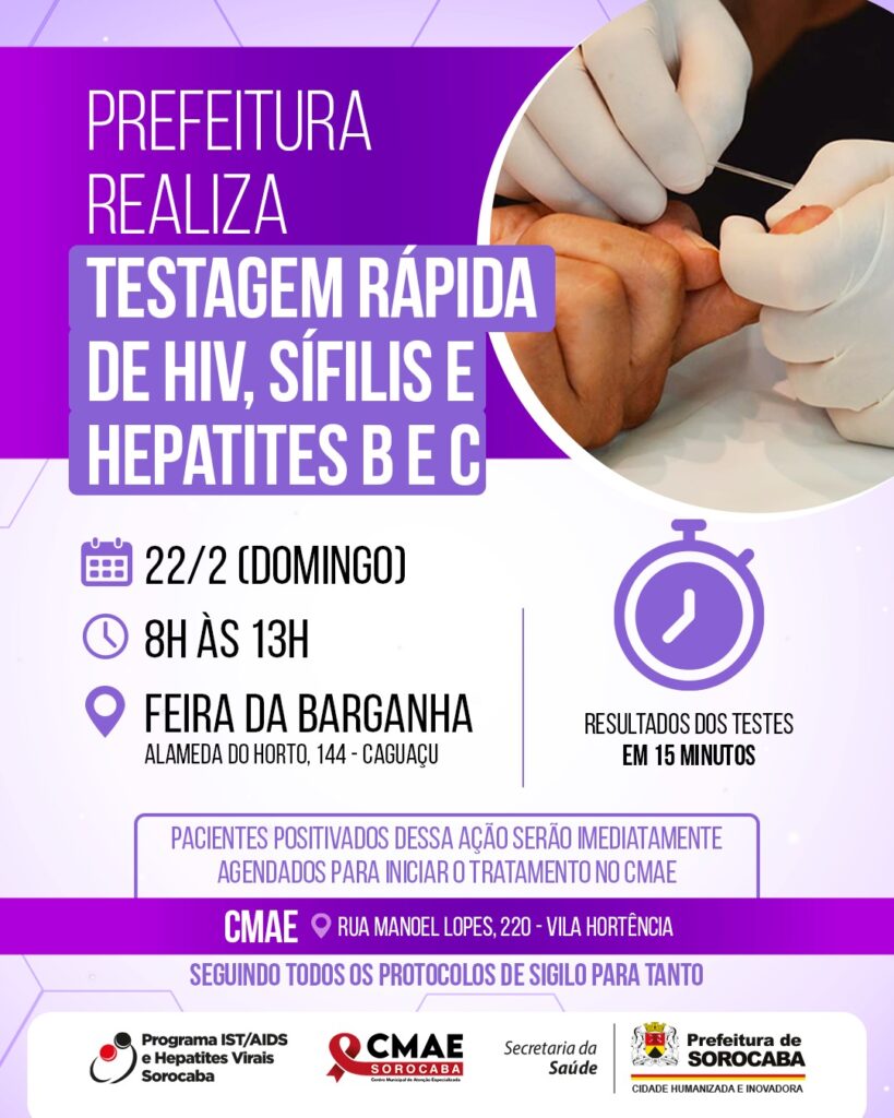 Com o objetivo de conscientizar a população sobre as ISTs (Infecções Sexualmente Transmissíveis), a Prefeitura de Sorocaba, por meio do Centro Municipal de Atenção Especializada (CMAE), da Secretaria da Saúde (SES), realizará, neste domingo (22), das 8h às 13h, na Feira da Barganha, uma ação para oferecer testes rápidos que servem para diagnosticar casos de HIV, Sífilis e Hepatites B e C.