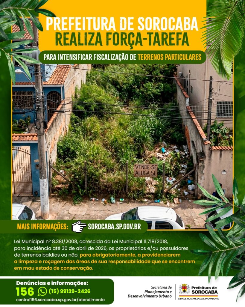 A Prefeitura de Sorocaba, por meio da Secretaria de Planejamento e Desenvolvimento Urbano (Seplan), inicia uma força-tarefa para intensificar a fiscalizações em terrenos particulares com mato alto e entulho. A ação é uma medida preventiva, sobretudo, para erradicar possíveis criadouros de Aedes aegypti e animais peçonhentos, regida por nova regulamentação.