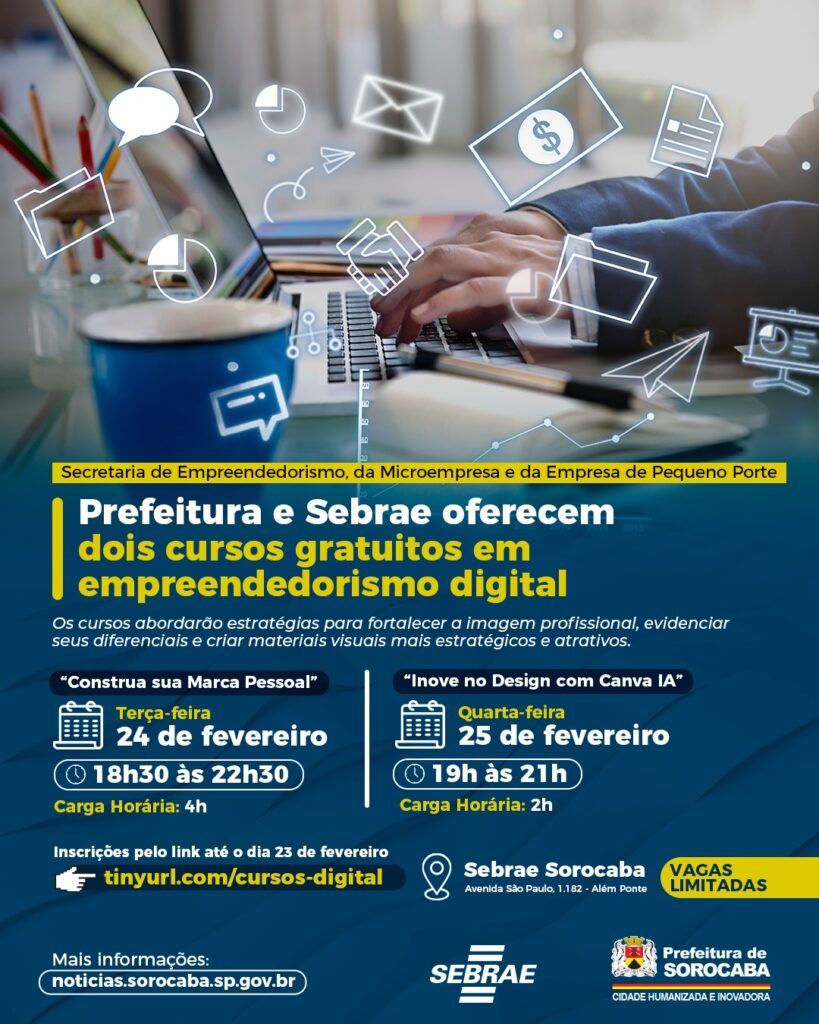 A Prefeitura de Sorocaba, por meio da Secretaria de Empreendedorismo, da Microempresa e da empresa de Pequeno Porte (Semepp) em parceria com o Serviço Brasileiro de Apoio às Micro e Pequenas Empresas (Sebrae) está com inscrições abertas para os cursos “Construa sua Marca Pessoal” e “Inove no Design com Canva IA”. Os cursos abordarão estratégias para fortalecer a imagem profissional, evidenciar seus diferenciais e criar materiais visuais mais estratégicos e atrativos.