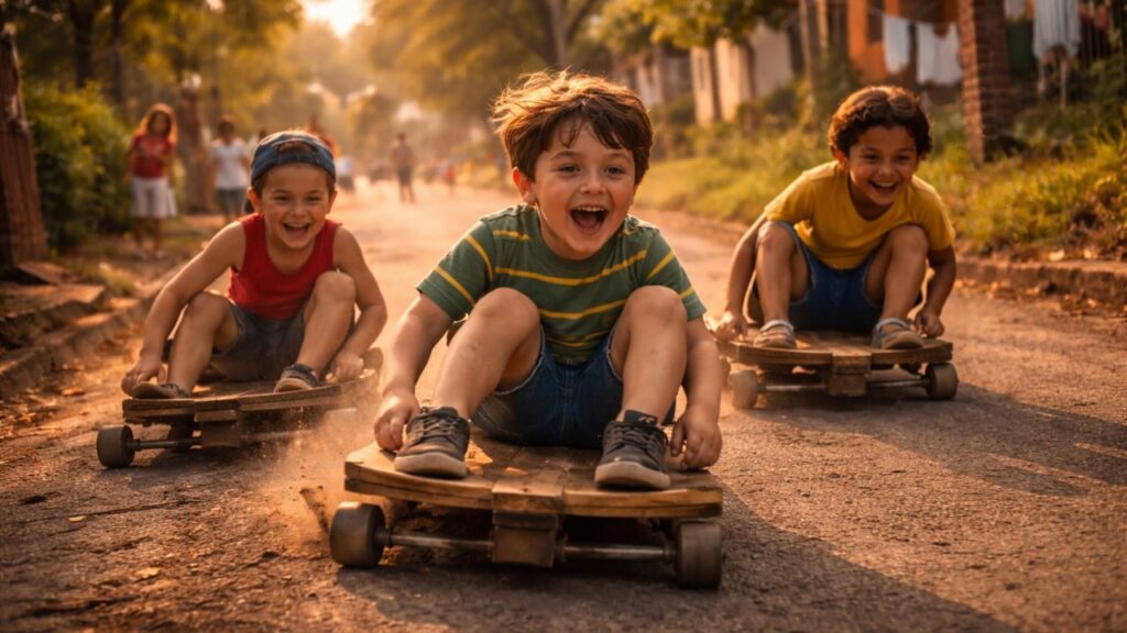 Em muitas cidades brasileiras, a lembrança de descer uma ladeira em um carrinho de rolimã ainda aparece com nitidez na memória de quem cresceu nas décadas passadas. A cena costuma ser a mesma: rua pouco movimentada, pedaços de madeira reaproveitados, rolamentos velhos de oficina e um grupo de crianças disputando quem chegava primeiro ao final do percurso. Esse tipo de diversão simples, sem necessidade de dinheiro, marcou uma geração e ainda hoje é associado à sensação de liberdade, criatividade e convivência coletiva na infância.