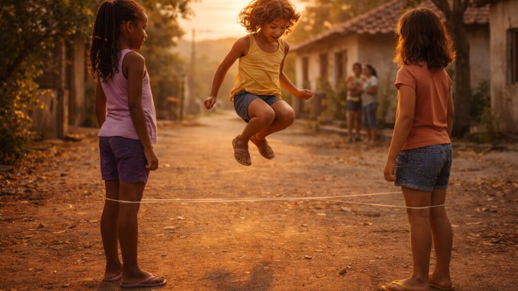 A memória afetiva das brincadeiras de infância costuma aparecer em detalhes simples, como a cantiga do pular elástico em roda, o chão de terra do quintal ou a calçada da rua. Em muitos bairros, essa cena ainda é comum: um grupo de crianças, um elástico esticado entre duas pessoas e uma sequência de pulos combinados, que ajudam a aprender a esperar a vez, respeitar o tempo do outro e construir regras em grupo.