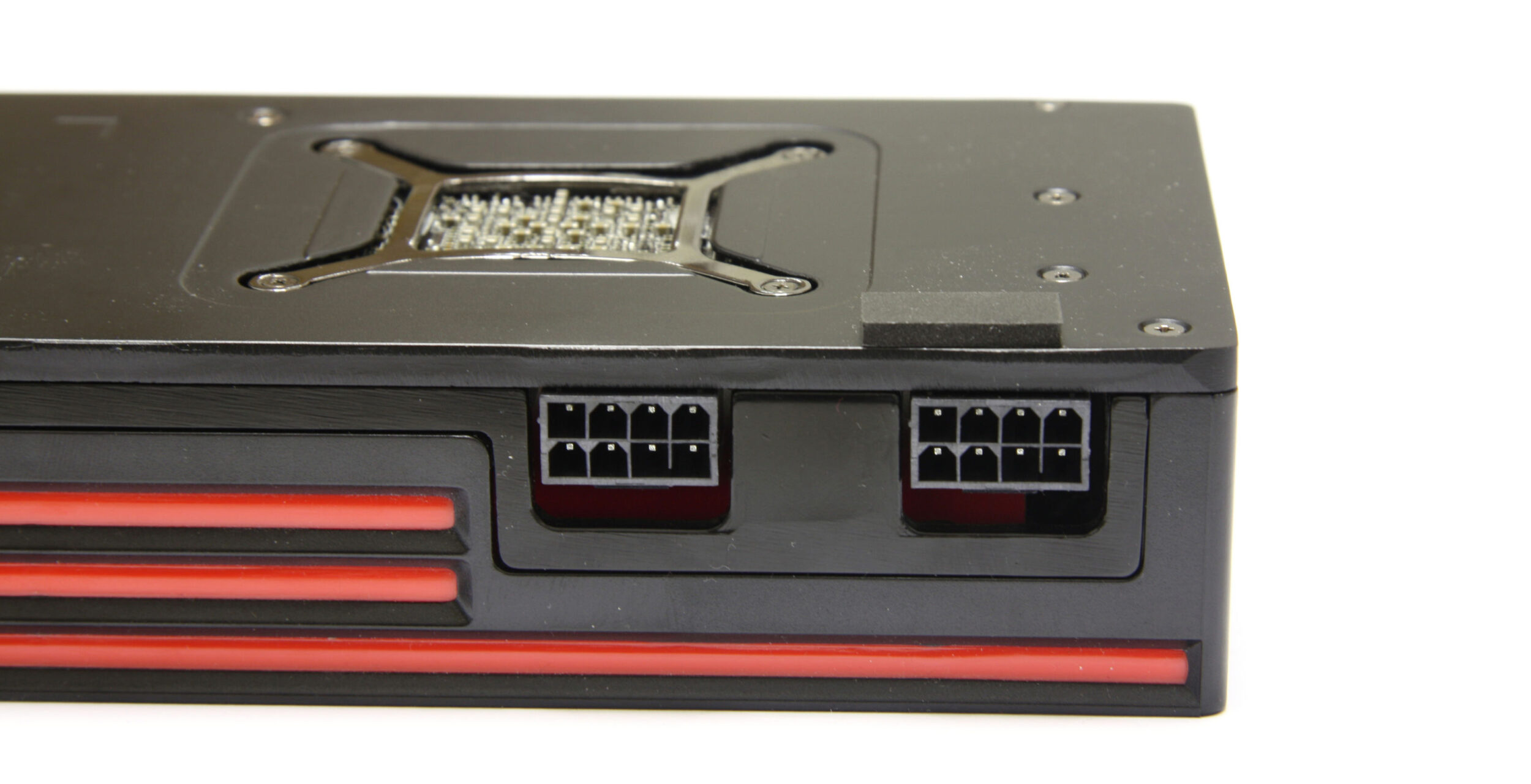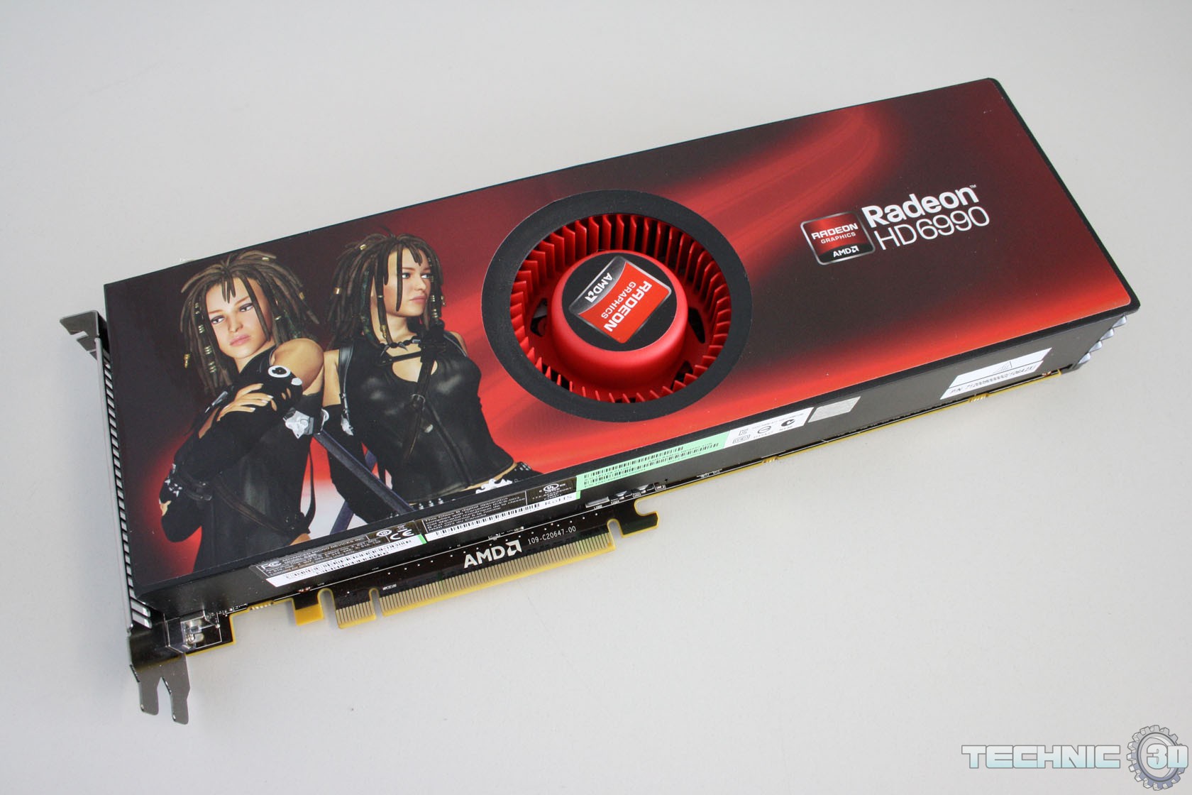 Para acomodar dois chips sem que um aquecesse o outro, a AMD posicionou o ventilador de 75 mm no centro da placa, com cada chip em uma extremidade e seu próprio dissipador de calor. Na HD 5970 anterior, o ar saía do primeiro chip já aquecido antes de tentar resfriar o segundo, problema estrutural que a posição central do cooler resolveu. A solução, porém, criou um efeito colateral: enquanto um lado expele o ar quente para fora do gabinete, o outro o devolve para dentro. Em gabinetes com boa ventilação, o impacto era administrável; em configurações mais fechadas, o calor residual afetava os demais componentes. A alimentação vinha de dois conectores de 8 pinos, posicionados no centro da PCB entre os dois chips, com seção de energia digital controlada por dois reguladores Volterra e memórias Hynix T2C já testadas em gerações anteriores.