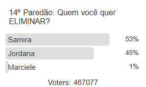 A diferença entre Samira e Jordana tem diminuído, o que pode indicar uma virada até o encerramento da votação. O resultado oficial será anunciado por Tadeu Schmidt na edição ao vivo do programa. Vale lembrar que os números do Votalhada não têm caráter científico e não influenciam o resultado da Globo.