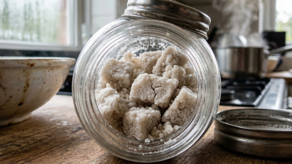 Esse truque simples funciona como um pequeno absorvedor de umidade, mantendo o sal seco e fácil de usar mesmo em cozinhas com bastante vapor.