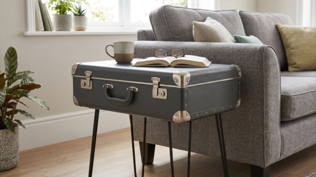 A reciclagem de malas de viagem não se limita às mesas. Dependendo do tamanho, do material e do estado de conservação, é possível adaptá-las para diversos cantos da casa, valorizando tanto a funcionalidade quanto o visual.