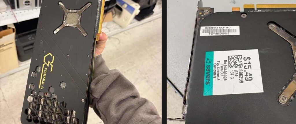 O usuário do Reddit entrou em um brechó procurando qualquer coisa barata e saiu com uma placa de vídeo da AMD que estava funncionando perfeitamente. Entre eletrônicos velhos e sem etiqueta, ele identificou uma ASRock Radeon RX 6950 XT OC Formula 16 GB e pagou US$ 15,49 por ela, cerca de R$ 80 na cotação atual. Sem grandes expectativas, levou a peça para casa para testar. Ela inicializou sem erros.