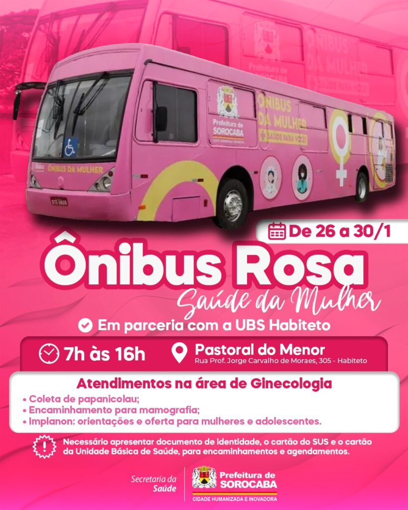 No local, estará disponível o Ônibus Rosa, além de coleta de papanicolau, encaminhamento para exames de mamografia e orientações para mulheres e adolescentes. A ação também contará com Ônibus Azul, de saúde do homem.