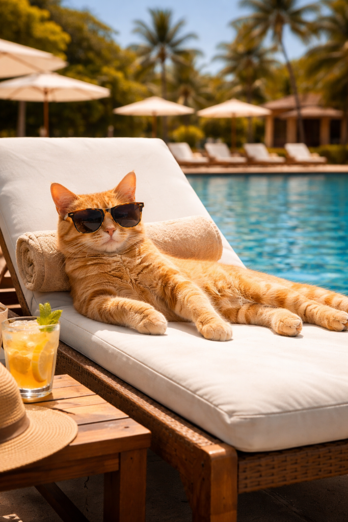 Os turistas se depararam com um pet relaxando tranquilamente em uma cadeira de piscina que supostamente seria deles. O gato parecia completamente à vontade, como se fosse o verdadeiro dono do espaço.