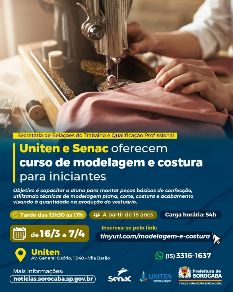 A Prefeitura de Sorocaba, por meio da Universidade do Trabalhador, Empreendedor e Negócios (Uniten), ligado à Secretaria de Relações do Trabalho e Qualificação Profissional (Sert), em parceria com o Serviço Nacional de Aprendizagem Comercial (Senac), está com inscrições abertas para o curso gratuito de modelagem e costura para iniciantes. O objetivo é capacitar o aluno para montar peças básicas de confecção, utilizando técnicas de modelagem plana, corte, costura e acabamento visando à quantidade na produção do vestuário.