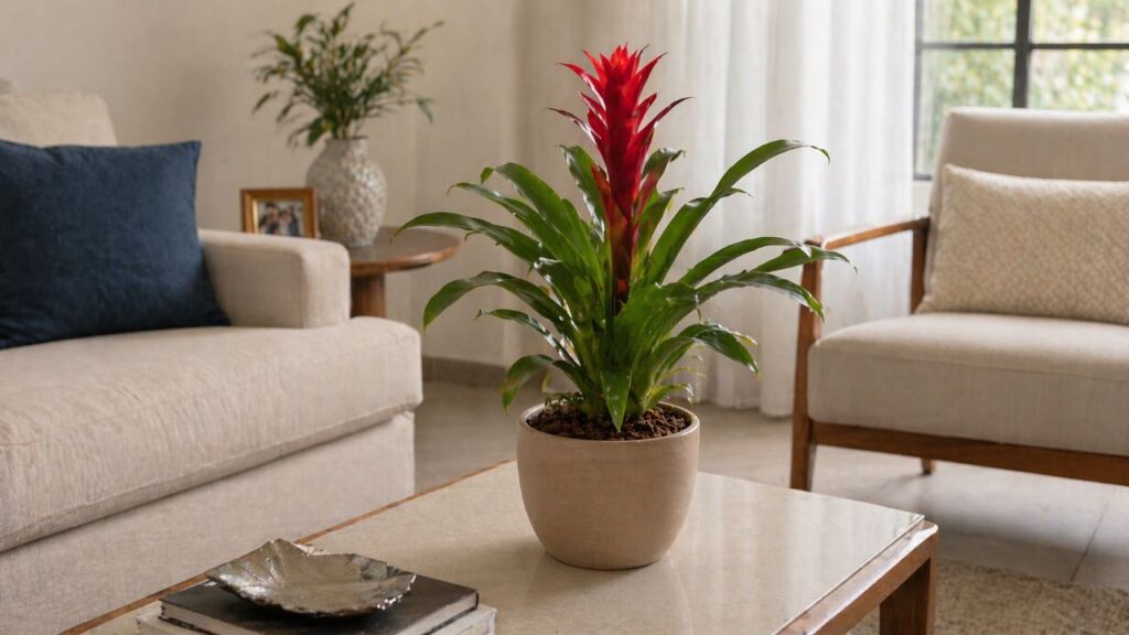 Quando usada corretamente, a bromélia na decoração cria um contraste natural e elegante. O resultado é um ambiente mais acolhedor, com cor e personalidade, sem exigir mudanças complexas.
