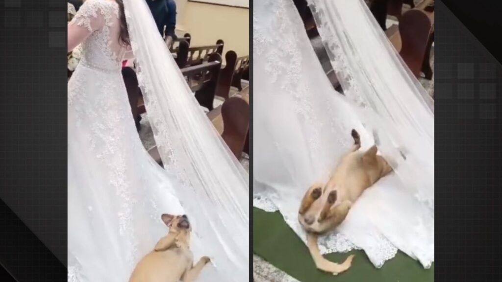 As imagens do evento mostram o animal deitado sobre o véu da noiva, brincando com o tecido do vestido e interagindo livremente com os presentes. A presença do cão garantiu cenas de descontração e muitas risadas entre os convidados.