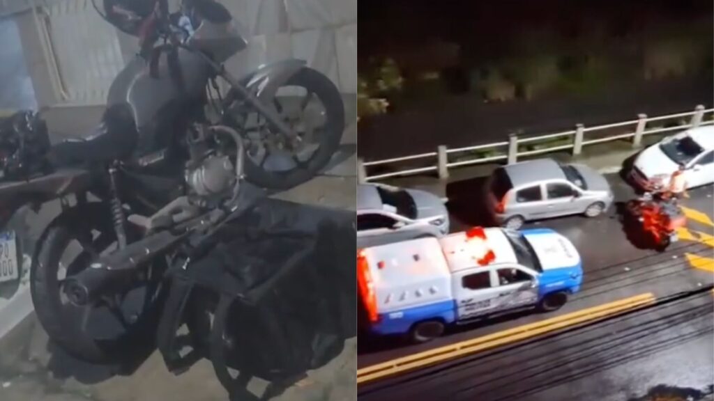 Imagens de câmeras de segurança instaladas na via registraram o momento em que dois homens armados, em uma segunda motocicleta, se aproximam e anunciam o assalto.