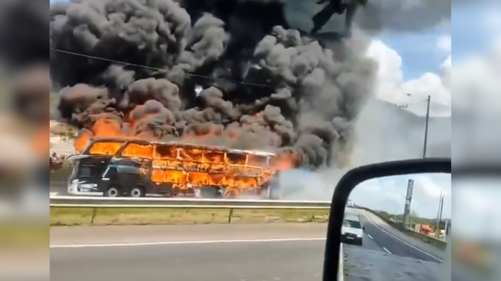 Vídeo: ônibus com mais de 30 passageiros pega fogo na BR-101, em SC