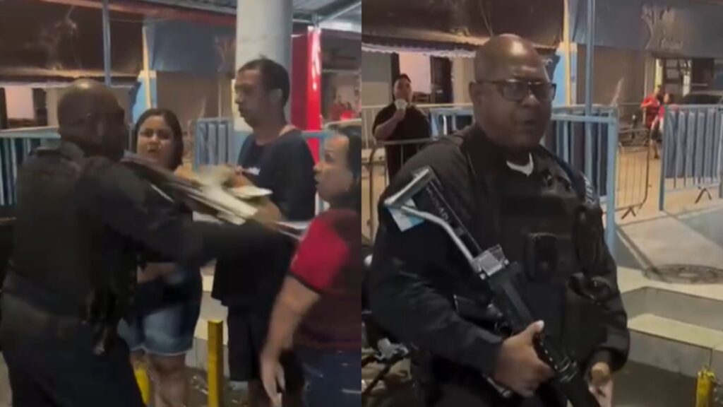 Gravações feitas por pessoas que estavam no local mostram o PM gritando, girando a arma e batendo com o cano dela no peitoral da vítima. Com o impulso, ela cai no chão, grita de dor e chora.