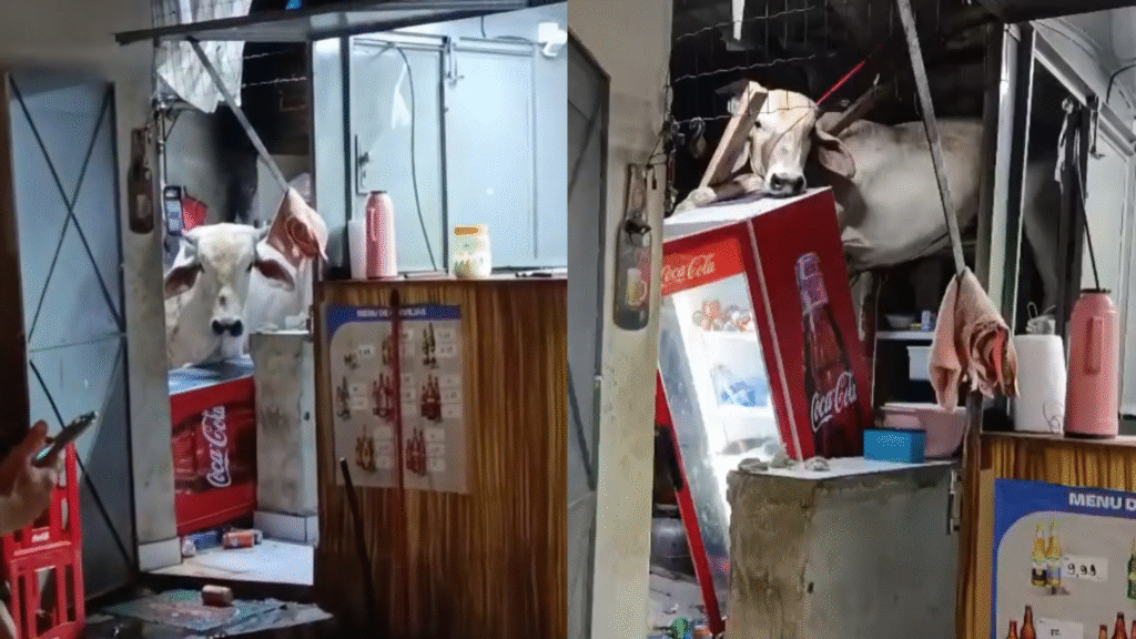 Segundo o restaurante, o incidente causou danos estruturais e prejuízos materiais significativos. Nas imagens é possível ver a vaca derrubando uma geladeira cheia de bebidas, que ficaram jogadas no chão. A presença do animal também danificou as telhas, um armário e outros objetos do restaurante. Veja a imagem: